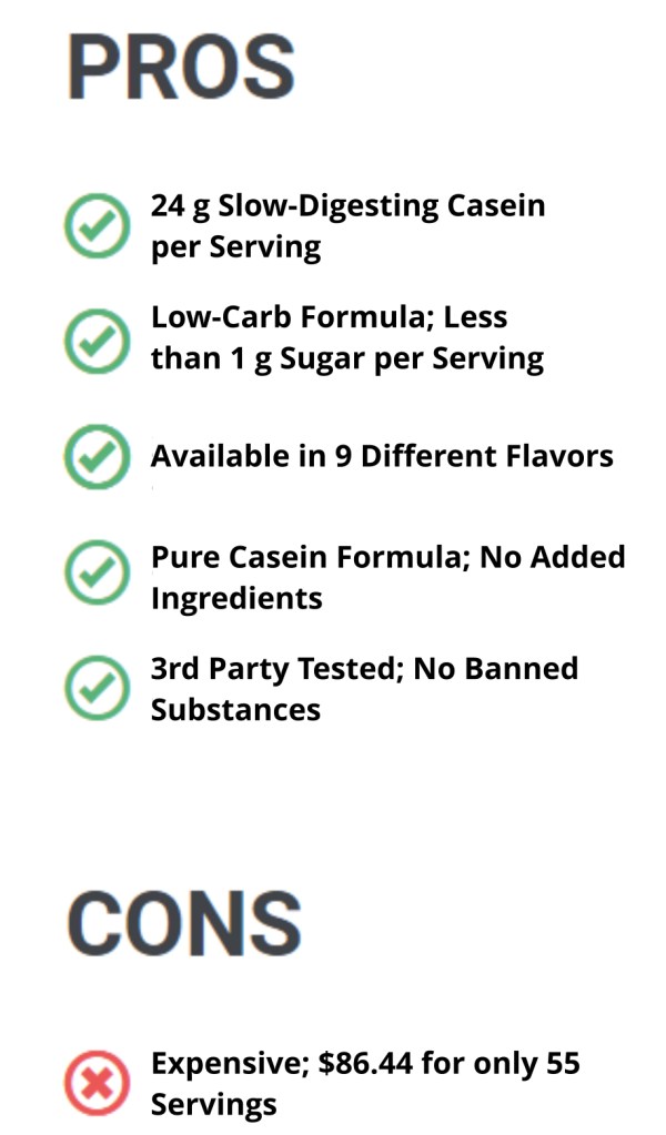 Optimum Nutrition’s Gold Standard 100% Casein is a pure, clean, quality slow-digesting protein and would be rated higher if not for its exorbitant price point: nearly $90 per 55 servings. That amounts to over $1.50 per 1-scoop serving.