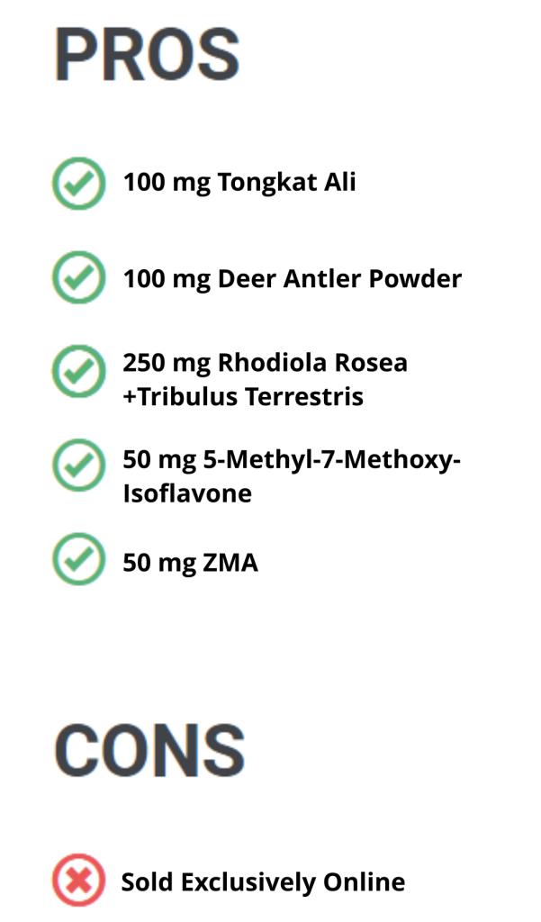 Unfortunately, it’s missing the ingredients we recommend, as it doesn’t contain any Tongkat Ali, Rhodiola Rosea, Deer Antler Powder, ZMA and 5-Methyl-7-Methoxy-Isoflavone. On top of that, this formula is a proprietary blend, which means we can’t tell you the exact dose of every ingredient in each blend.