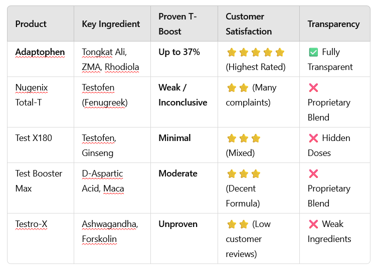 Our research uncovered a major issue in the testosterone booster industry: Most products simply don’t work. Many are loaded with under-dosed ingredients or compounds that lack scientific backing. Let’s break down how Adaptophen stacks up against the competition: