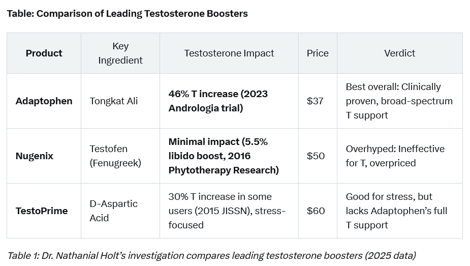 Mass-market boosters like Nugenix and TestoPrime are no better—empty promises with weak results. Nugenix’s Testofen showed a pathetic 5.5% libido bump, zero T gain (Phytotherapy Research, 2016). TestoPrime’s D-Aspartic Acid helps stress but leaves T flat. These aren’t solutions—they’re distractions.