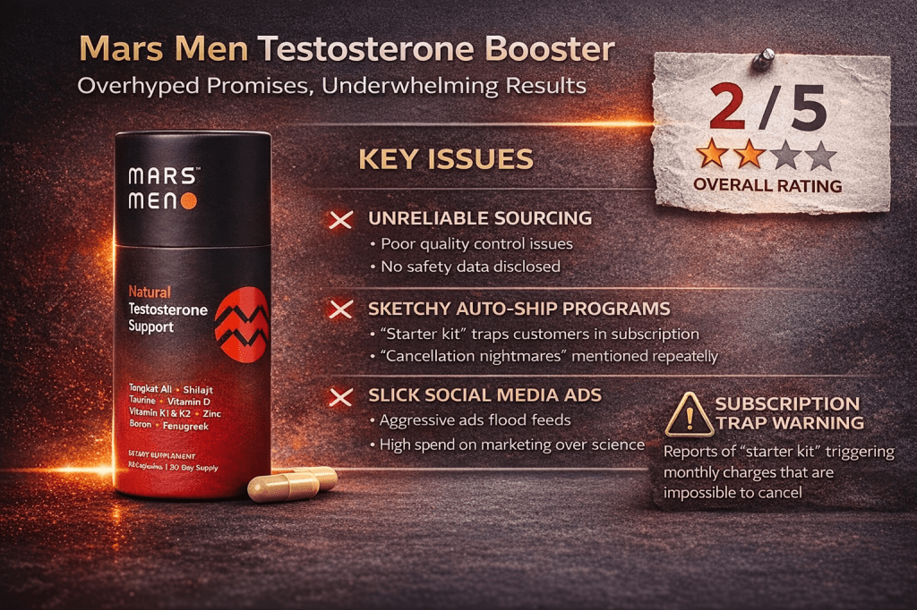 Overall Assessment: Mars Men scrapes a dismal 2 out of 5 rating. Its ingredients are a mishmash of trendy but dubiously dosed elements, claims overhyped without robust backing, and marketing a digital deluge that masks mediocrity. The predatory auto-ship schemes seal the deal as a trap for desperate men, eroding any goodwill. If low T plagues you, see a doc for tests and proven fixes like diet tweaks or TRT—dodge this Martian misfire and its earthly headaches.