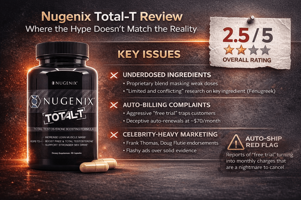 Overall Assessment: Nugenix Total-T earns a low rating of 2.5 out of 5. Its ingredients are unremarkable and underdosed, claims overhyped without product trials, and marketing celebrity-focused at the expense of transparency. Worst are the predatory auto-ship tactics, which trap unsuspecting buyers and erode trust. For men experiencing low T symptoms, consult a doctor for blood tests and evidence-based options like lifestyle changes or prescribed therapies—skip this supplement and its billing headaches.