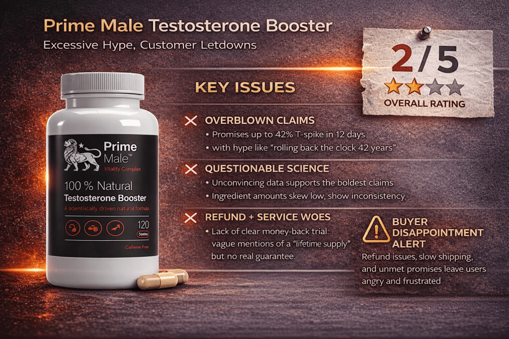 In the bustling testosterone supplement market, Prime Male brands itself as a “natural vitality complex” tailored for men over 30 grappling with declining energy, muscle tone, libido, and overall zest. Advertised as a precision-formulated blend of 12 nutrients to spike testosterone by up to 42% in 12 days, torch belly fat, amp strength, elevate mood, and restore youthful vigor without synthetics or doctor visits, it claims to rewind the hormonal clock by decades. Priced at around $75 for a 30-day supply (with bundles shaving it to $50-60/month), it’s sold solely via the official site primemale.com, often through targeted online ads and affiliate pushes. But does it deliver? We probed its ingredients, backing data, promotional tactics, and operations using independent studies, clinical insights, and user accounts. The verdict uncovers a supplement bloated with bold assertions but bogged down by shaky science, inflated expectations, and customer gripes.
